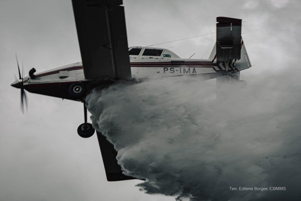 Única força auxiliar participante, o CBMMS atuou por meio do GOA em simulações de combate a incêndios, utilizando a aeronave Air Tractor para lançamentos de água.