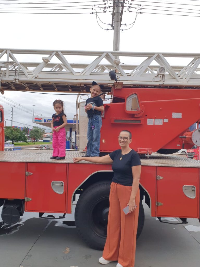 Ao lado da mãe, Tatiani Vargas Galvão, do pai, Veriton Fernandes Ortiz, e da irmãzinha Manuela Galvão Fernandes, Luísa visitou as instalações do 1º Grupamento de Bombeiros Militar (1º GBM), localizado na Avenida Costa e Silva, em Campo Grande.
